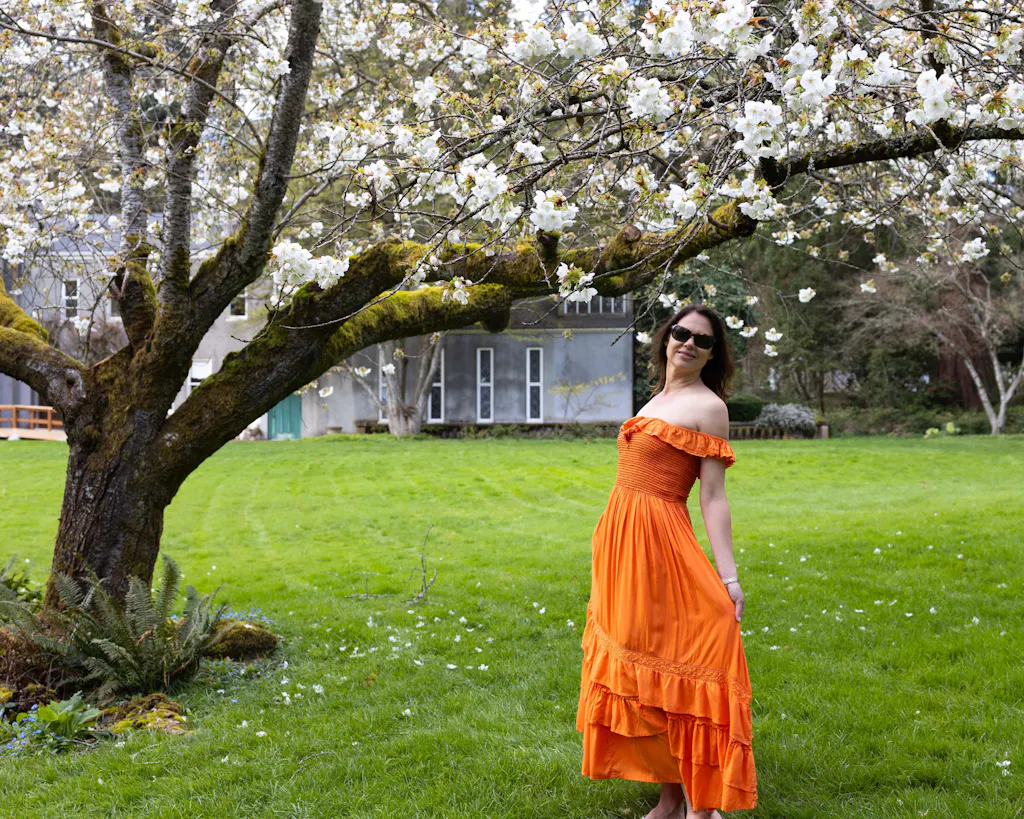 I bought this Aria Maxi dress recently. I love it!! Not everyone can wear orange, but it works with my skin. I love the flowy fabric, and off-the-shoulder style. I'll be wearing it to beautiful spots around Oregon!!